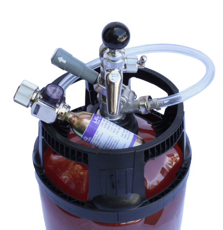 A tall cylindrical cooler configured to hold a 5.16 gallon (1/6 barrel) keg, keg coupler, ice, and mini nitrogen cylinder with the regulator. Includes stainless steel faucet mounted on cooler.